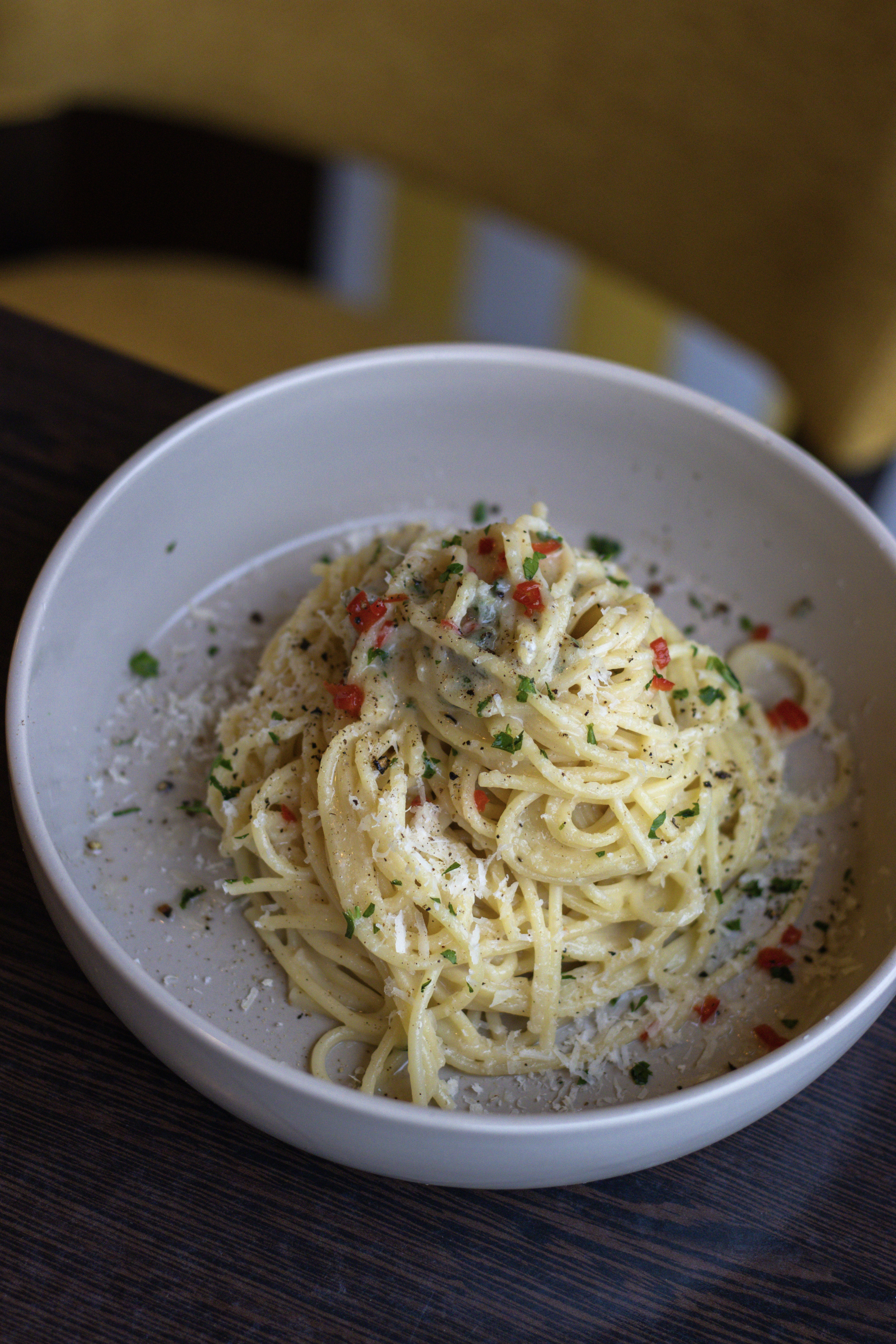 těstoviny, konfitovaný česnek, chilli paprička, jalapeño, parmazán, hladkolistá petržel
